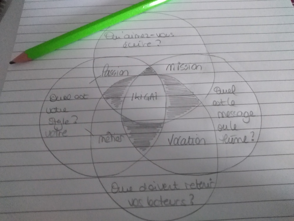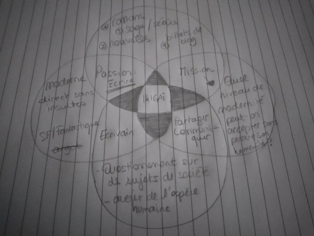 Dans le cadre de l’écriture d’un roman, je me suis donc dit que je pourrais détourner légèrement le principe de l’ikigai pour en faire un ikigai littéraire.